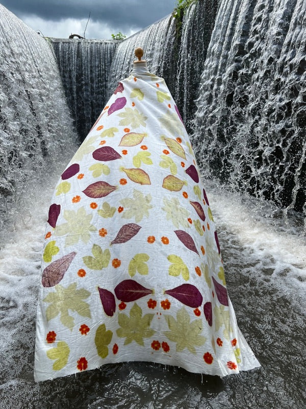 Sobald der Dämpfvorgang beendet ist, rollen wir das Material aus – wie es im Ecoprinting üblich ist.In diesem Moment zeigt sich die Magie: die Blattabdrücke, die Farben, die Textur – noch warm vom Dampf und voller Leben.