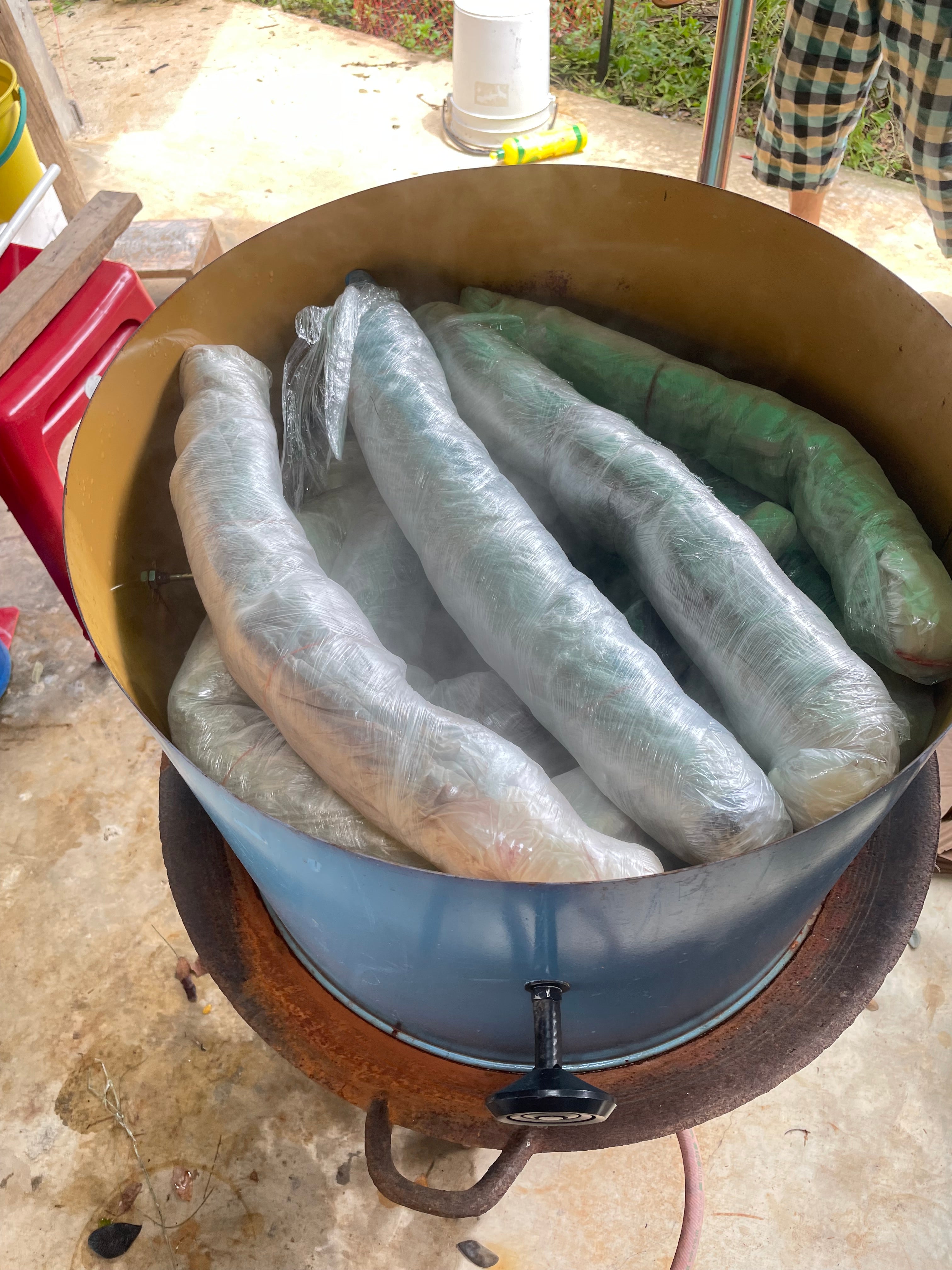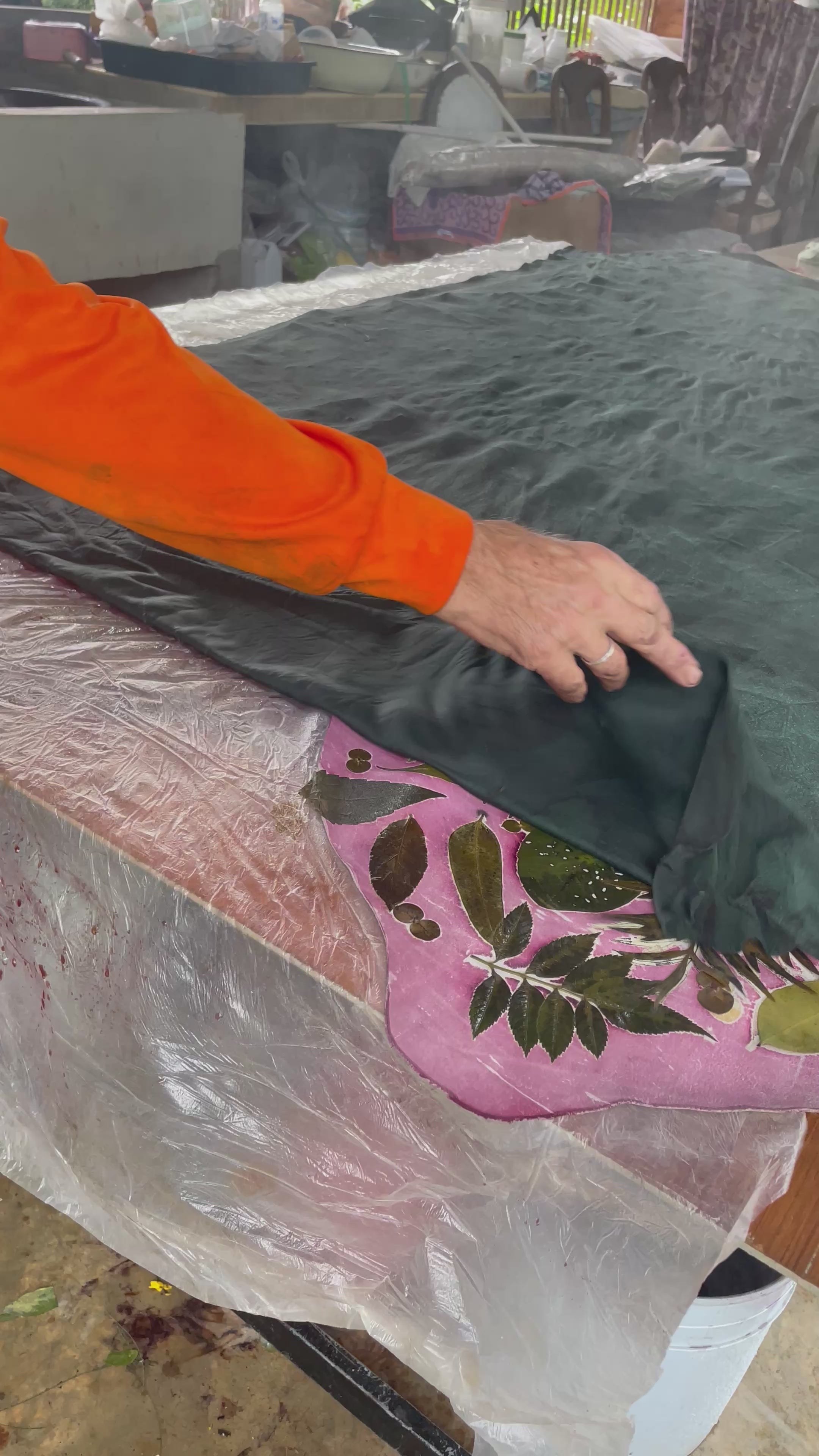 Anschließend wird alles fest aufgerollt – meist um Holz oder Metall – und gut verschnürt. Im Dampf lösen sich die Farbstoffe aus den Pflanzen und übertragen sich auf das Material.